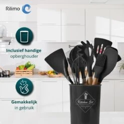 Keukengerei Set Met Houder – Kookgerei Set Spatel Pot – Keukengerei Keukenset – 12 Delige Zwart Hout