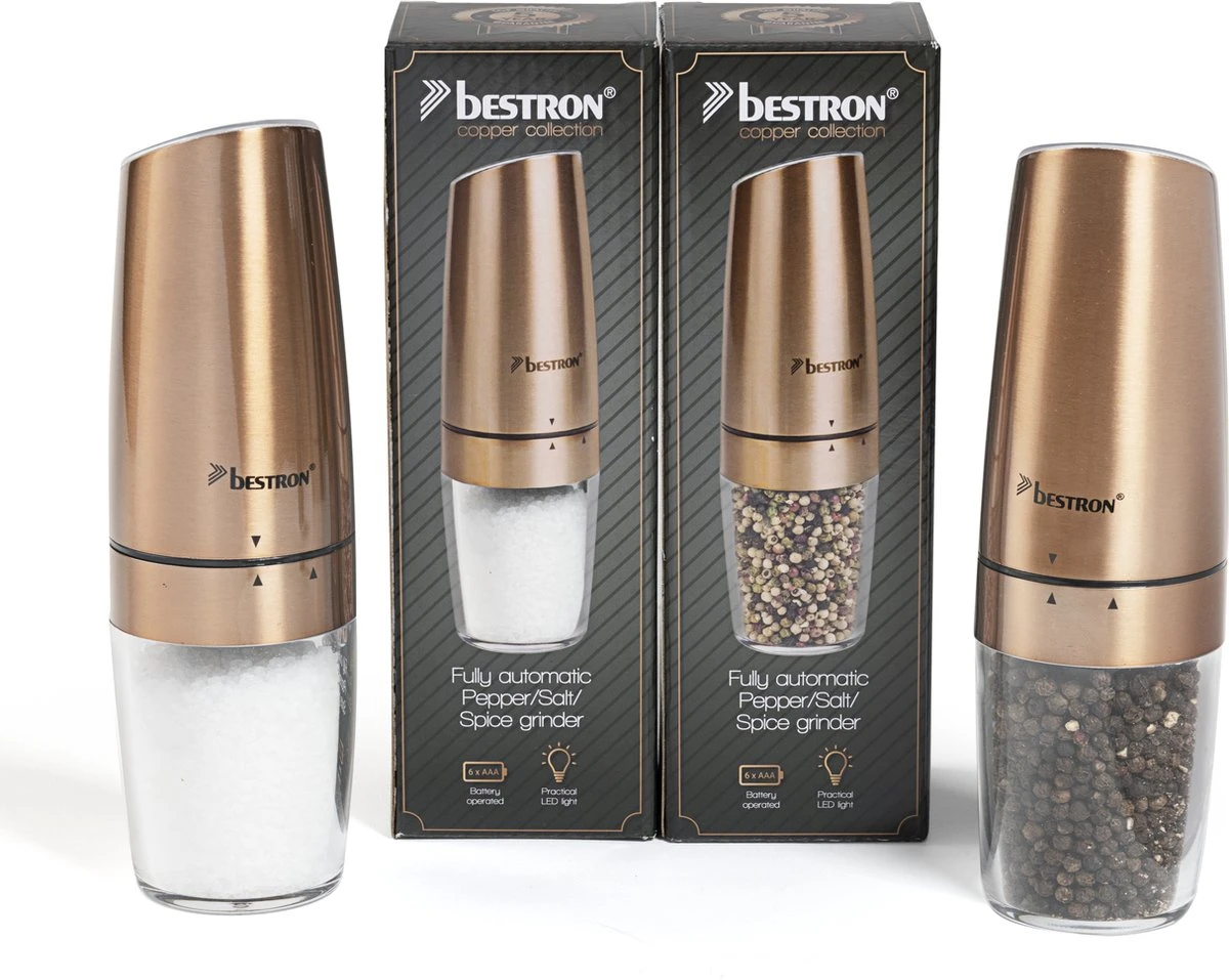 Bestron 2x Elektrische Zout- & Pepermolen, Kruidenmolen Met LED Verlichting & “Gravity” Start- / Stop Functie, Keramisch Maalwerk, Vordeelset, Concept: Copper Collection
