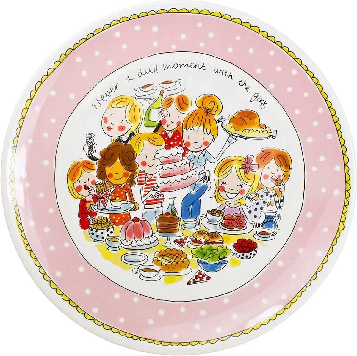Serveer lekkernijen in stijl met dit grote platte bord van Blond Amsterdam. Het bord heeft een diameter van 33 cm en een roze, gestipte rand. Het is onderdeel van de Even Bijkletsen serie dus beschikt ook over een vrolijk tafereel van een groep vriendinnen. Ontdek de rest van het vrolijke Blond Amsterdam servies en alle andere borden in onze webshop.