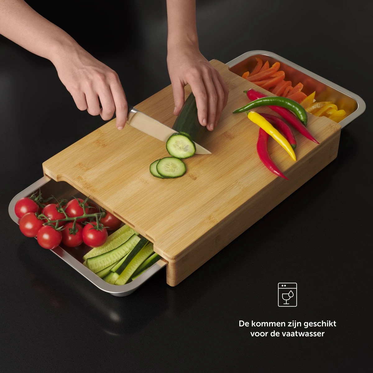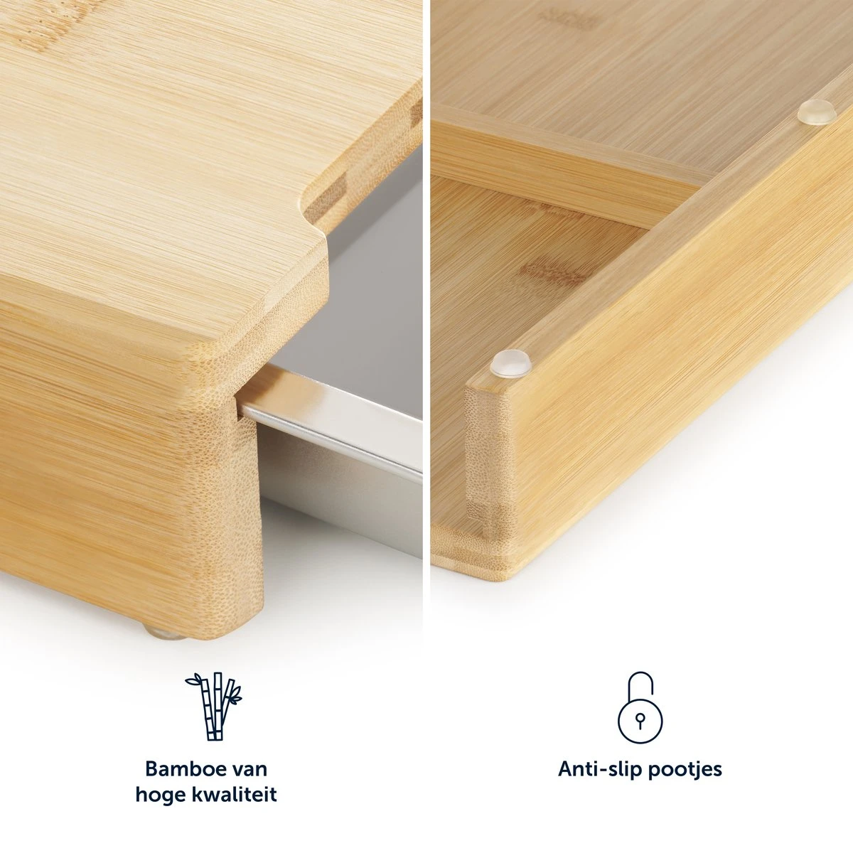 De snijplank bamboe is eenvoudig met de hand schoon te maken, de lekbakjes zijn geschikt voor de vaatwasser. De houten plank heeft twee grote opvangbakken en een extra, aparte bak. Dit maakt het scheiden van afval en voedsel een fluitje van een cent! Daarbij is de snijplank hout voorzien van anti-slip voetjes waardoor hij stevig op het aanrecht blijft staan.