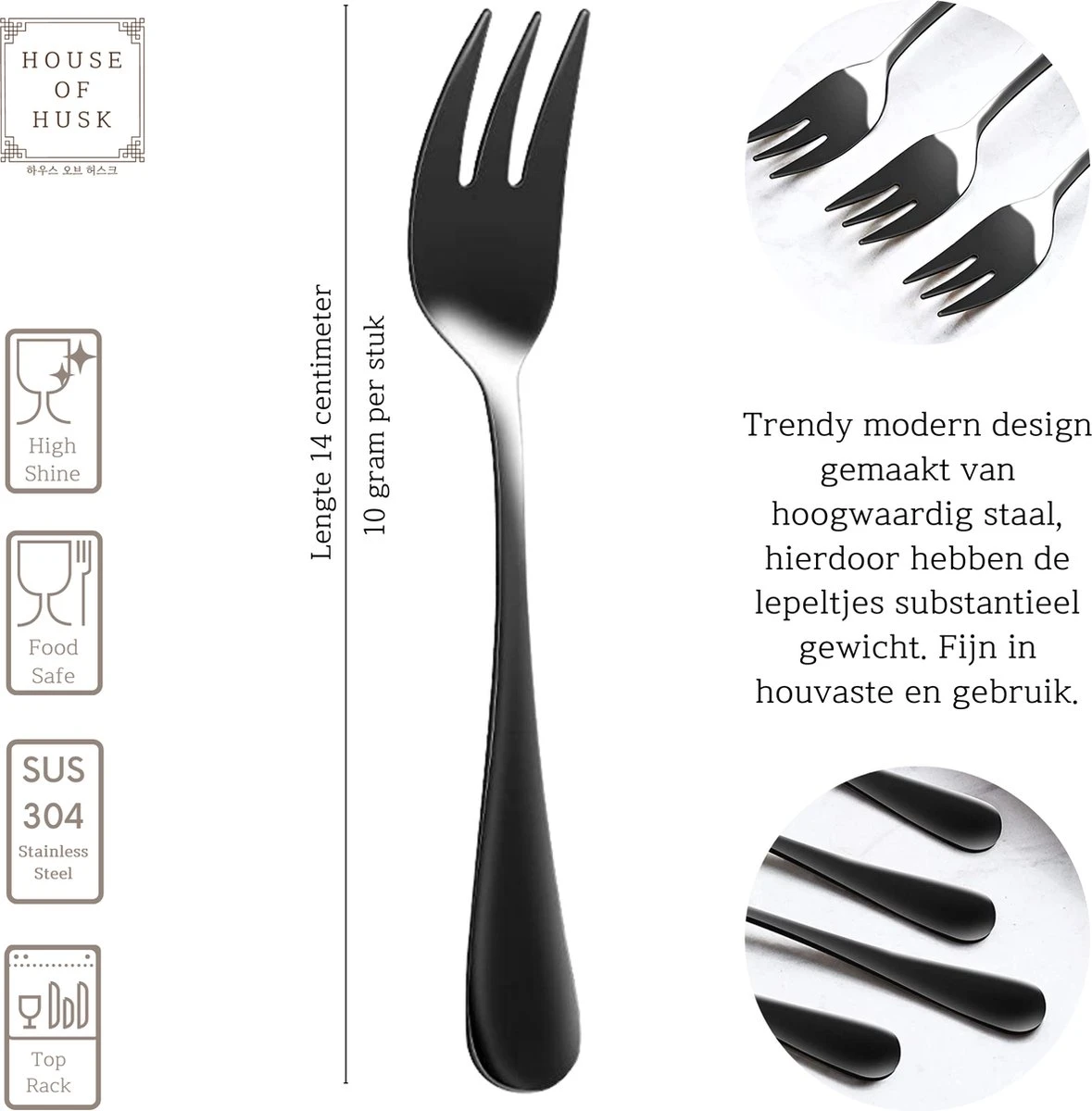 Onze House of Husk ® dessertvorkjes zijn zeer veelzijdig waardoor ze van alle gemakken voorzien. Gebruik kan bijvoorbeeld voor; taart, cake, fruit, maar ook als cocktailprikker op bijvoorbeel een tapas- en kaasplankje. Met dit prachtig zwart rvs, stijlvol ontworpen dessertvorkje pimp je elke snack tafel of gebakje tot een luxe culinair momentje.