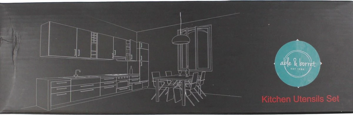 Werken in een keuken vraagt om goed ‘gereedschap’. Met deze 13-delige Able & Borret keukenset kom je een heel eind. In de set zijn een groot aantal lepels en roerspatels opgenomen, er is een garde en verder een keukentang. Ook een aardappelstamper en een pannenlikker zijn inbegrepen. De set wordt gecompleteerd met een handige houder voor alle materialen plus enkele haakjes. Uiteraard kun je de diverse onderdelen van de set ook gewoon opbergen in je bestaande keukenlades.
