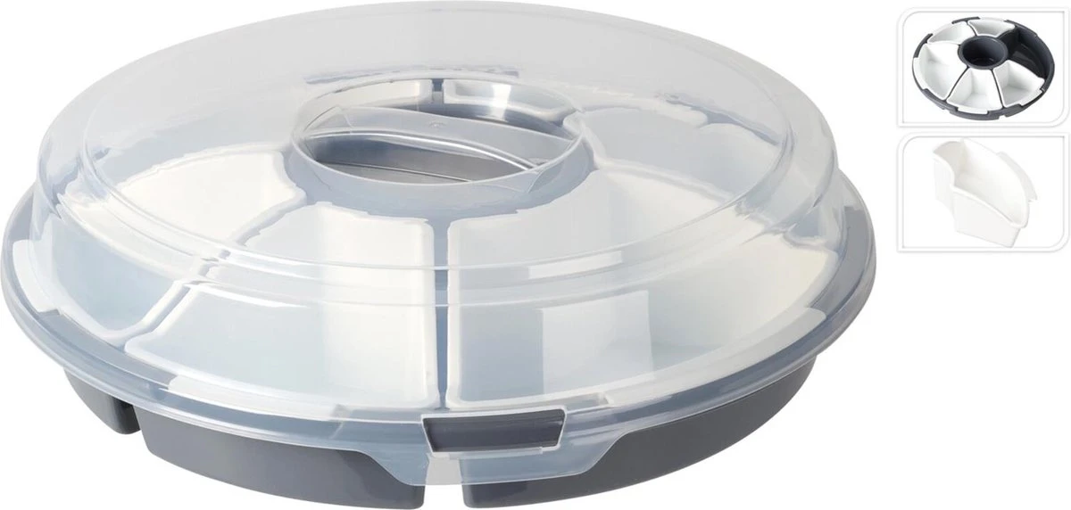 Serveerschaal met vakverdeling en deksel kunststof Ø33xh9cm grijs
