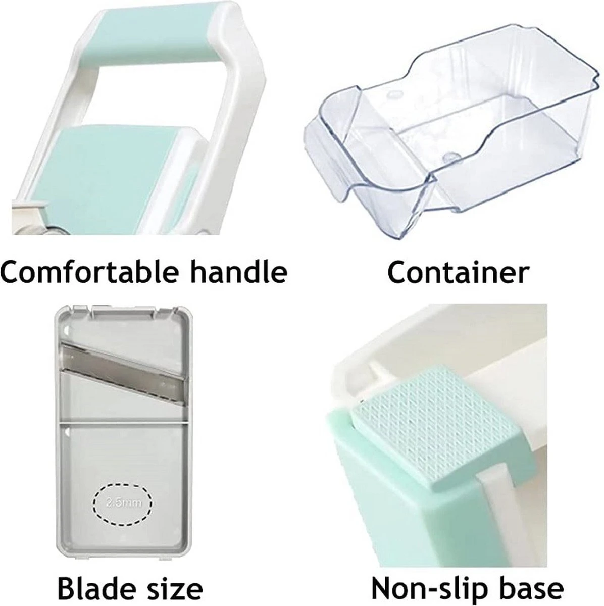 Deze vijf-in-één keukensnijder heeft vijf dus verwisselbare bladen. Met dit multi-functionele apparaat kun je dus niet alleen plakjes fijn/middel/grof snijden maar ook staafjes of sliertjes maken. De opvouwbare beugel ondersteunt de keukensnijder, zodat deze stabiel op het aanrecht staat. De transparante opvangbak zorgt ervoor dat de groenten onmiddellijk hygiënisch worden opgevangen. Dit bespaart jou tijd en zorgt ervoor dat de keuken schoon blijft. Het apparaat is eenvoudig te reinigen.