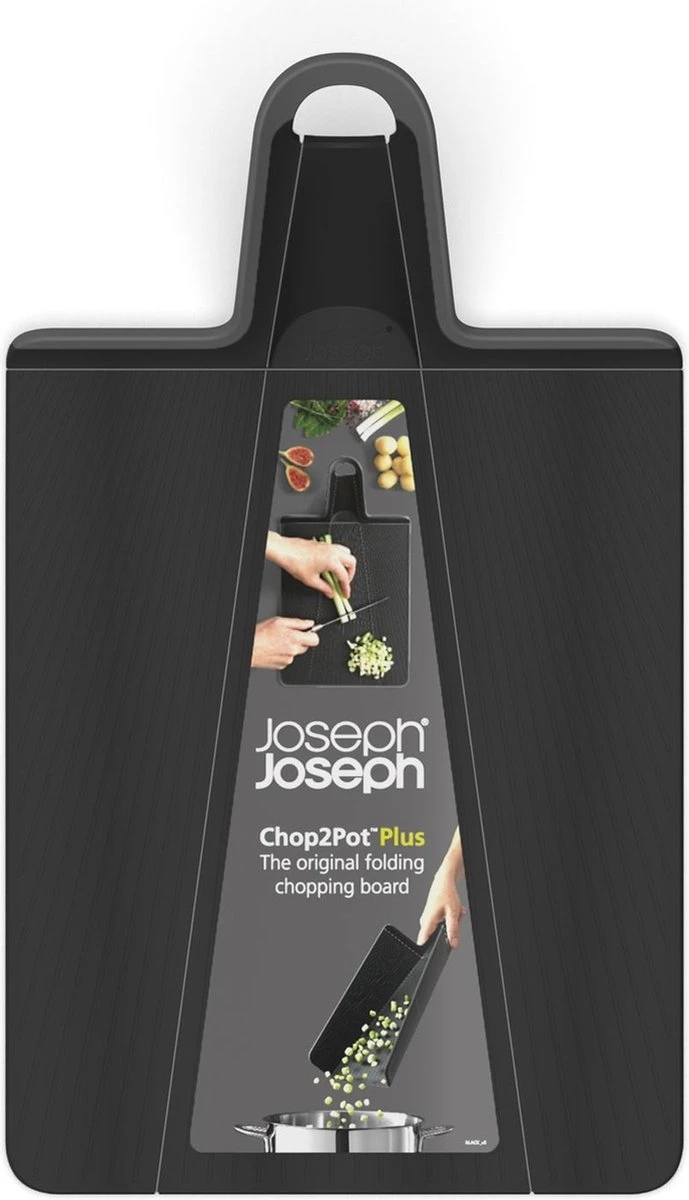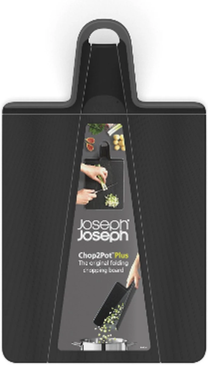 Dé award-winning Chop2Pot Plus snijplank met de innovatieve Joseph Joseph scharnier techniek! Knijp de handgreep simpelweg samen en de zijkanten van de plank vouwen zich naar boven op. De vers gesneden ingrediënten kun je nu zonder enige moeite zo de pan in schuiven. Het snijvlak van de kunststof snijplank is voorzien van een gestreepte structuur wat de plank mesvriendelijk maakt. Verder beschikt de snijplank over een soft-grip handgreep en anti-slip voetjes. Na gebruik kan de plank worden schoongemaakt in de vaatwasser. Let op! Het snijvlak is ontworpen om lichte snijmarkeringen te vertonen tijdens het gebruik.