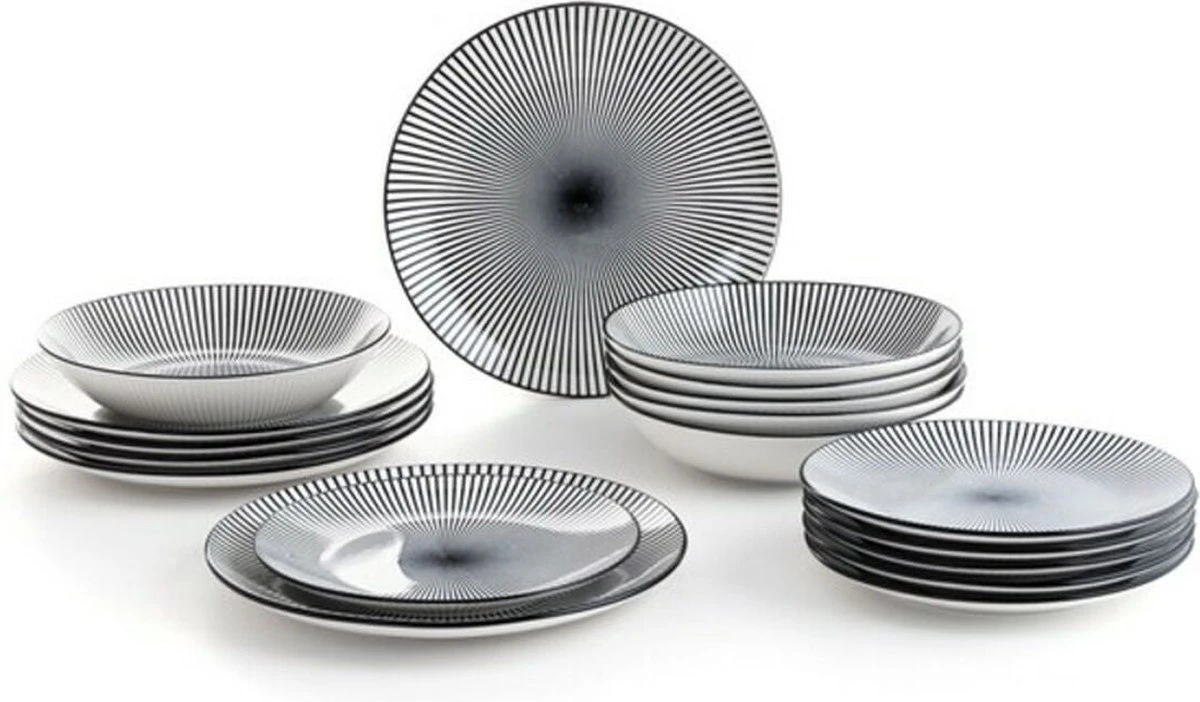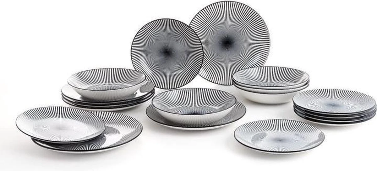 Met deze bordenset ziet jouw gedekte tafel er stijlvol uit. De borden zijn gemaakt van porselein en kunnen het beste met de hand afgewassen worden. De set bestaat uit 6 soep-, diner- en dessertborden met een hip zwart-wit printje.