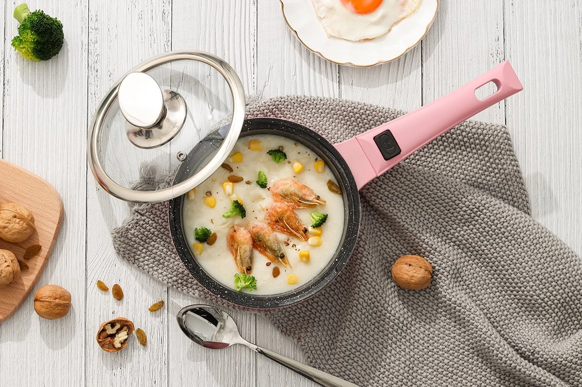 Swiss Pro+ | Set 14 Delige Pannenset | Inductie – Pannensets – Glazen deksel – Met afneembare handgreep – Marmeren interieur -PFAS-vrij | Pink