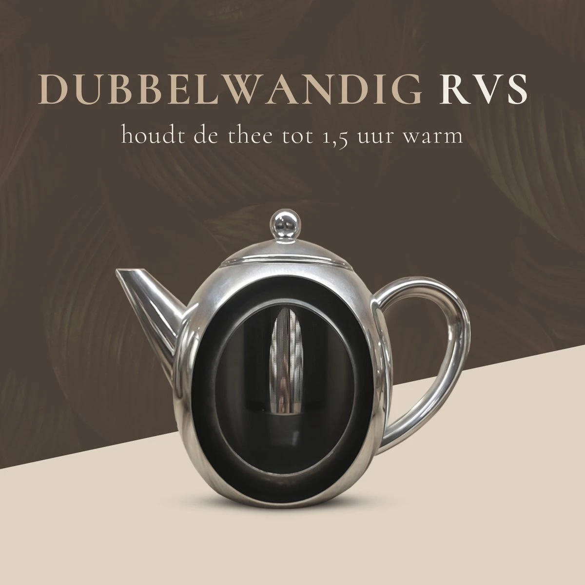 De theepot is dubbelwandig en gemaakt van roestvrij staal. Het voordeel is dat de pot een isolerende functie heeft, waarbij je thee extra lang warm blijft. De smaak blijft optimaal door het roestvrij staal en de thee behoudt voor een lange tijd zijn temperatuur.